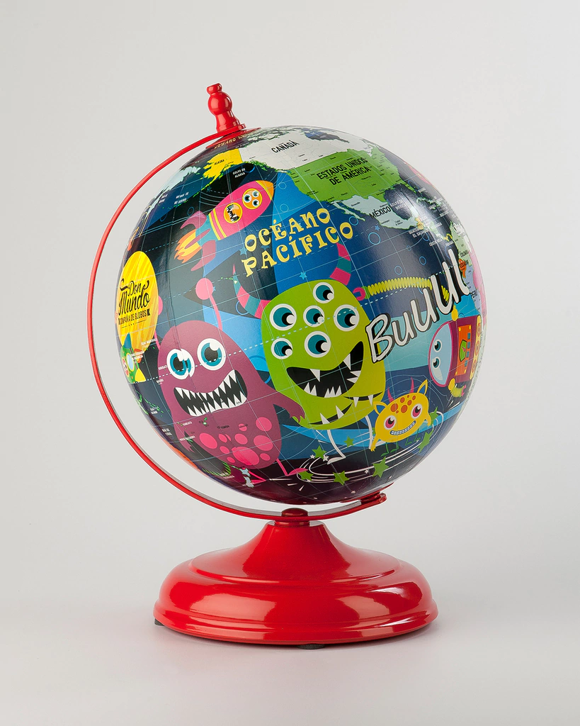 Globo terráqueo con ilustraciones infantiles. Base amarilla de metal.